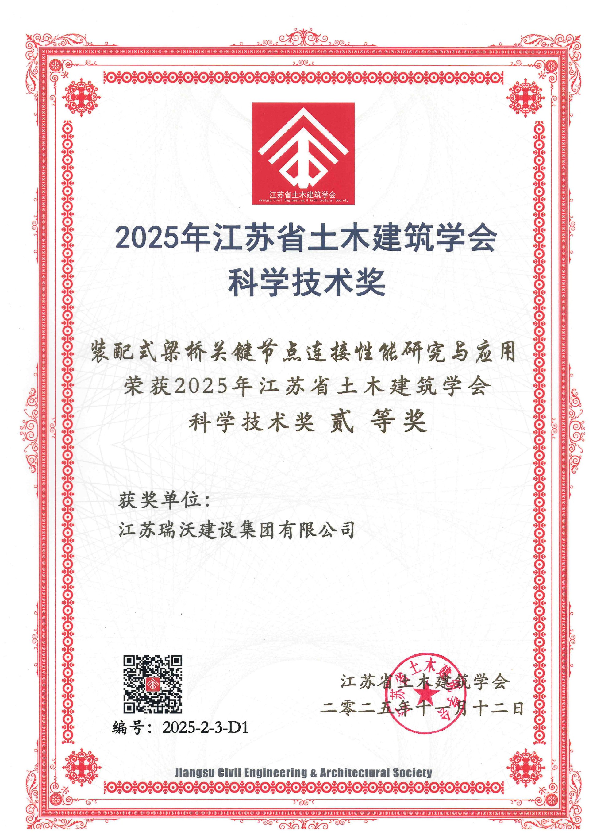 近日,江蘇省土木建筑學會十一屆理事會第五次會議在南京召開,會議正式公布2025年度江蘇省土木建筑學會科學技術獎評選結果。集團完成的《裝配式梁橋關鍵節點···